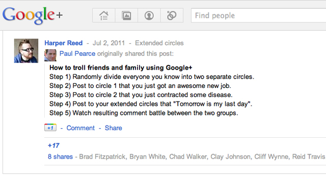 La chose la plus convaincante que j’ai vu, en effet, c’est ce post sur la façon de troller les gens sur Google+ qui est tout du moins divertissant et aborde la notion du semi-partage d’une manière novatrice ^^.