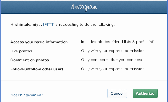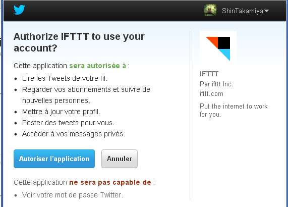 Pour commencer aller sur https://ifttt.com/recipes/68915 (vous devez avoir un compte), ensuite confirmer l’autorisation sur les deux services ( Instagram et Twitter )