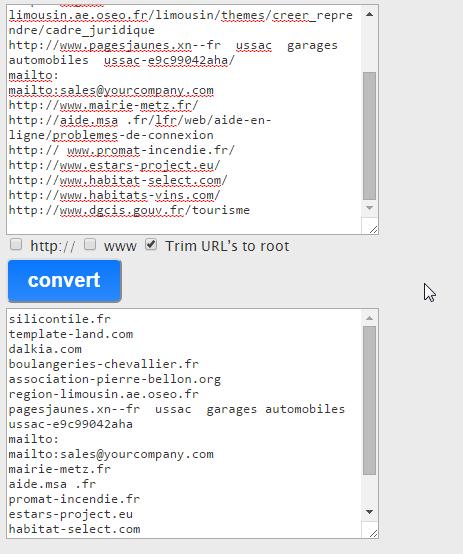Une fois notre liste de noms de domaine filtré, il faudra faire un TRIM en bulk pour ne laisser que la racine des noms de domaine. J’utilise personnellement ce petit utilitaire quand je fais ceci manuellement sinon j’utilise la fonction TRIM sur Zennoposter en automatisation.