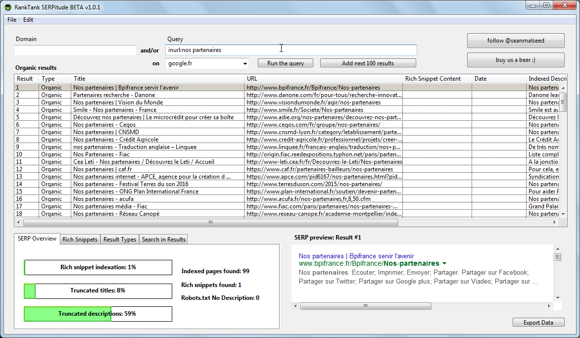 Personnellement, j’utilise Zennoposter et Winautomation pour automatiser tout le processus mais il y a plus d’outils sur le net (ou sinon à la mano) pour lister vos liens à scrapper. Donc je vous propose d’utiliser Serpitude un outil gratuit disponible sur Windows et Mac et qui permet très facilement d’extraire les résultats de recherche Google en deux clics.