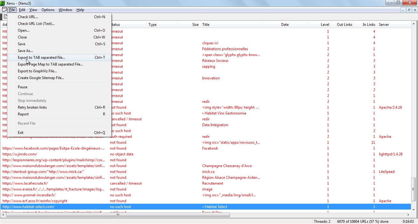 Nous allons ici, tester la réponse des serveurs de tous les liens retrouvés dans les URLS scrappées via Google et pour ce faire nous aurons besoin d’un outil qui facilite cette tâche : Xenu.
